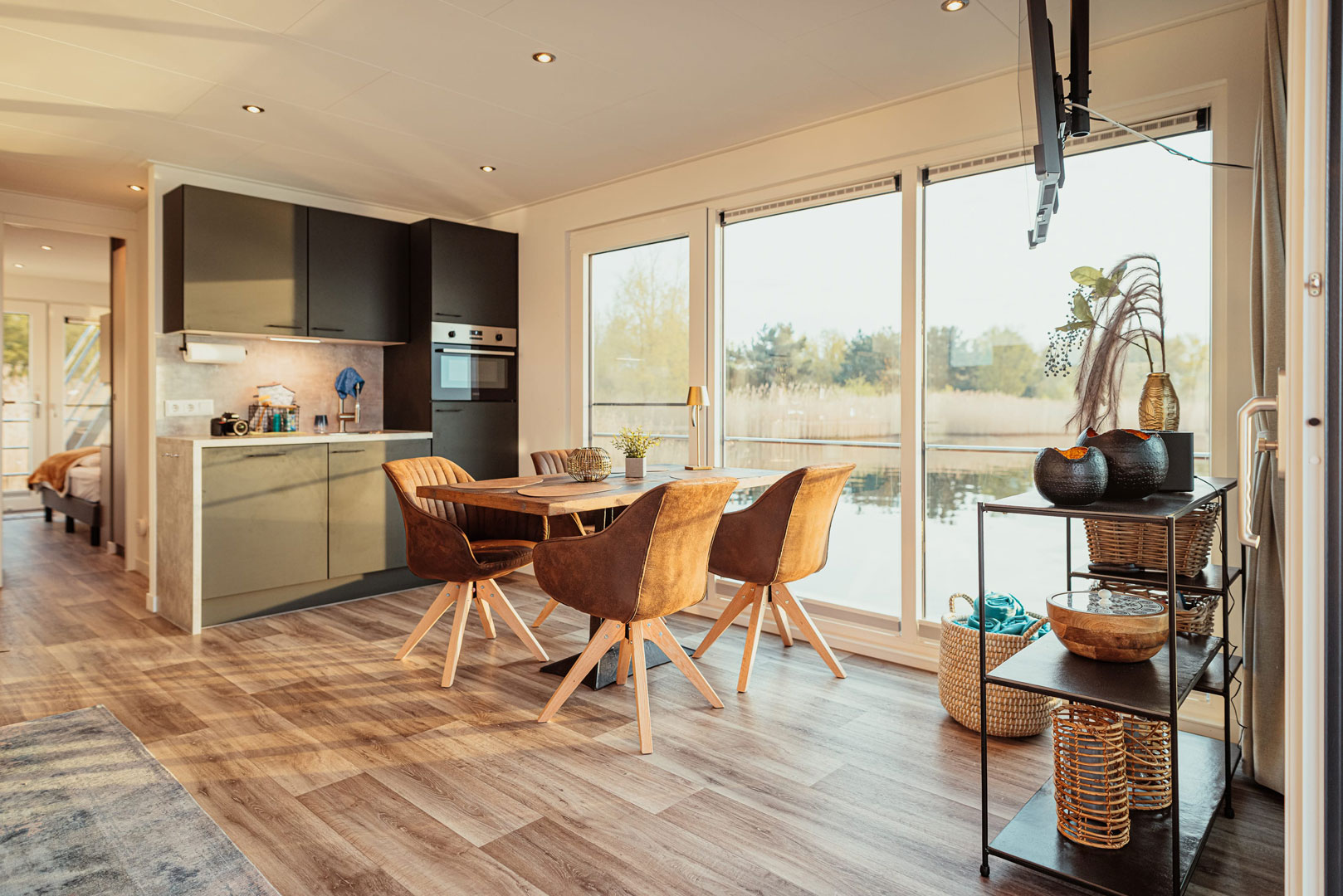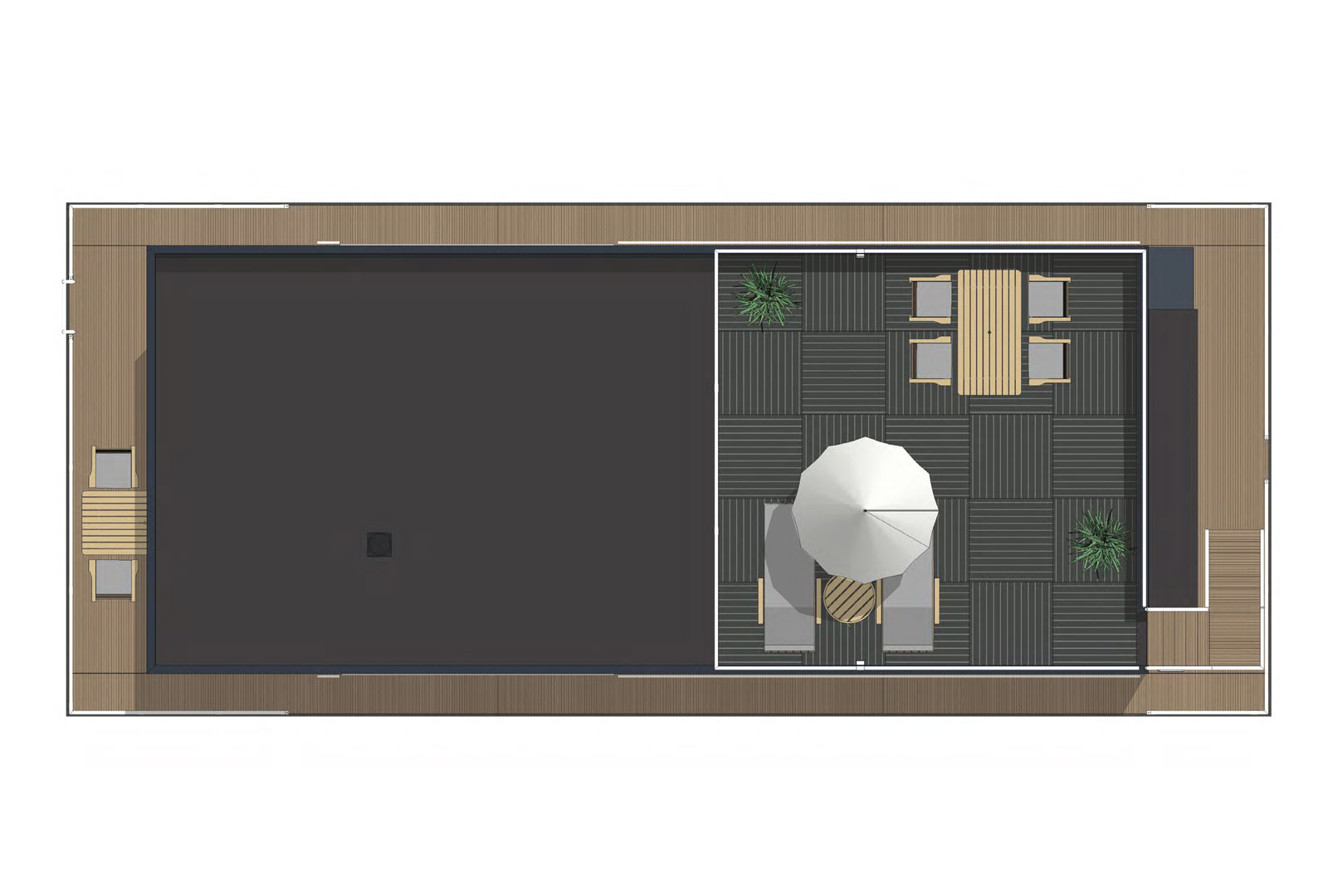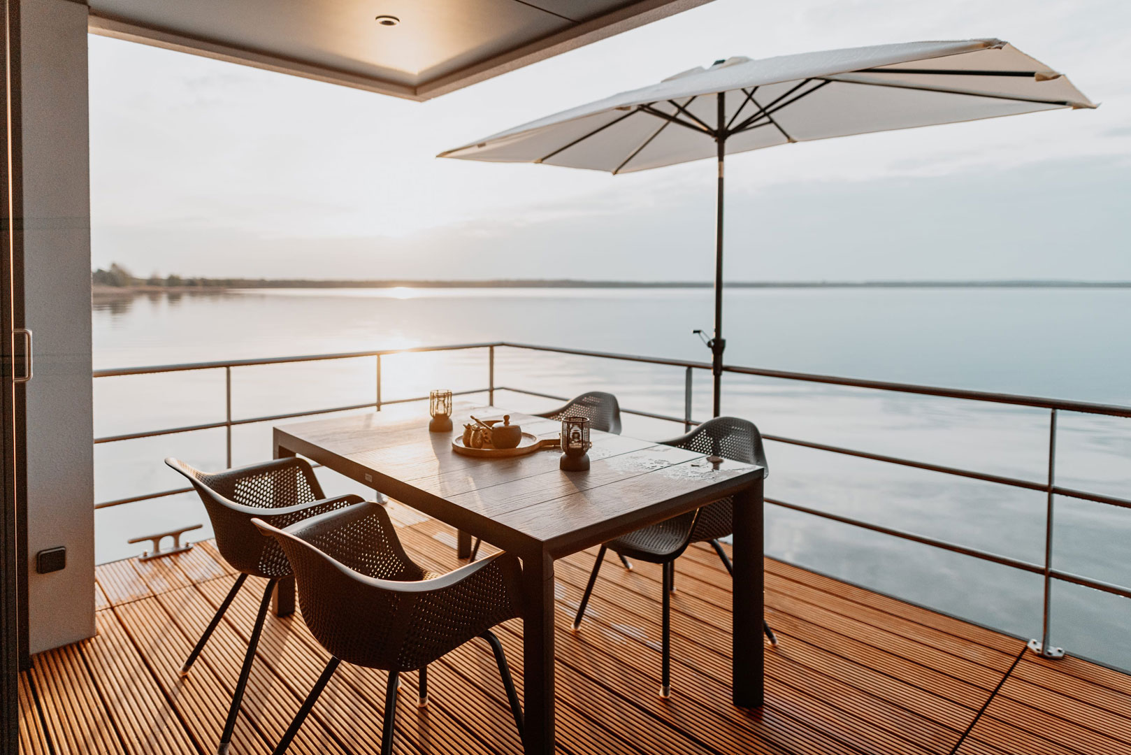 Unser floating 44.3 ist ein schwimmendes Ferienhaus auf einem Betonschwimmkörper. Es verbindet den Charme eines Hausbootes mit neuesten technischen Anforderungen und Feinheiten im modernen Design. Mit seiner komfortablen Ausstattung entspricht es den Ansprüchen an ein schönes Ferienhaus und bietet sehr viel Platz für einen außergewöhnlichen maritimen Familienurlaub mit 4 bis 6 Personen. Der Ponton ermöglicht eine maximale Anzahl von 25 Personen an Bord als Stilllieger im Hafen, was auch gesellige Abendessen und größere Zusammenkünfte möglich macht. Auf 44 Quadratmetern Wohnfläche und mit einer modernen Luft-Luftwärmepumpen-Heizung lässt es sich auch an kalten Tagen großzügig leben. Viel schöner ist es jedoch, Sonne, Wind und Wasser auf der 15 Quadratmeter großen Terrasse am Bug oder der 25 Quadratmeter großen Terrasse auf dem Oberdeck zu genießen. Die Umlauffläche von 7 Quadratmetern ermöglicht ein bequemes Umrunden des floating 44.3. Sie verfügen über ein vollwertiges gefliestes Badezimmer mit elektrischer Fußbodenheizung, Waschtisch, Dusche und hochwertigen Badmöbeln, sowie ein extra WC mit Waschtisch, eine vollausgestattete Küchenzeile und alles andere, was Sie für einen schönen Tag und bei Nacht auf dem Wasser benötigen. Die drei abgeschlossenen Innenräume und zwei Terrassen bieten besonders bei Nutzung mit mehreren Personen an Bord ausreichend Rückzugsmöglichkeiten, um in Ruhe Kraft zu tanken und die Sonne und das Wasser zu genießen.