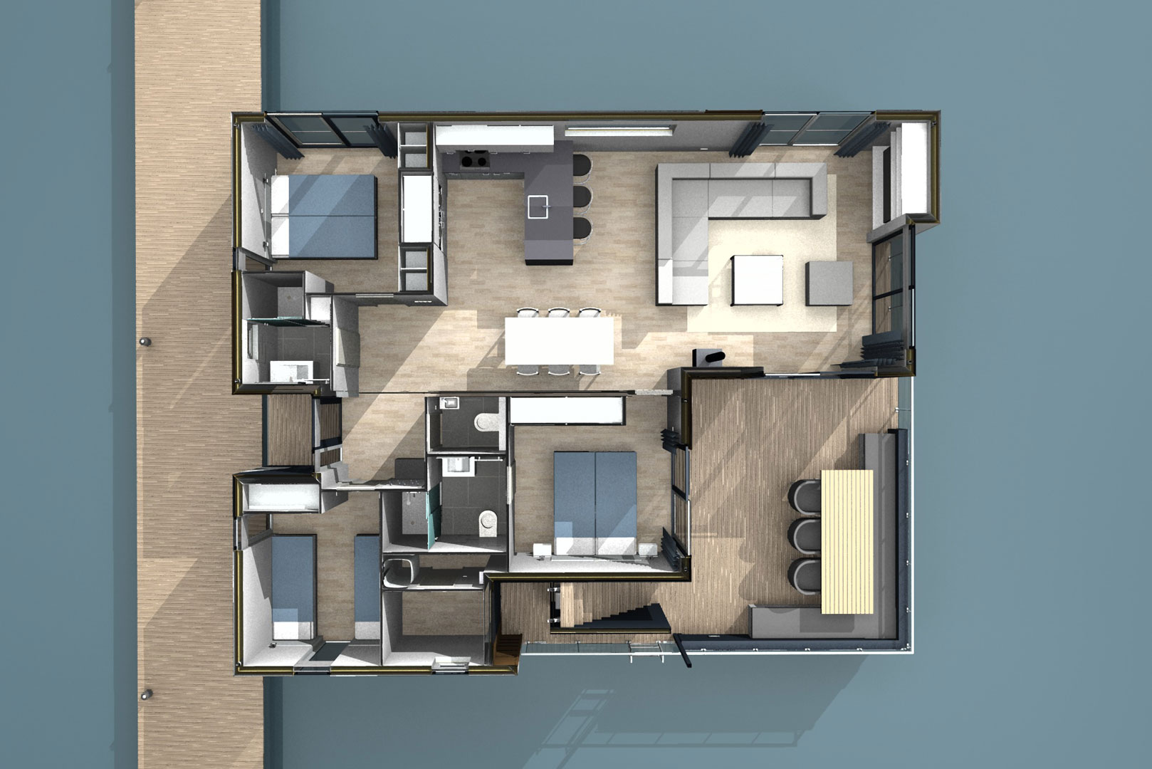 Unser floating 85.2 ist die Luxusvariante eines schwimmenden Ferienhauses. Es ist auf einem Betonschwimmkörper gegründet. Es verbindet den Charme eines schwimmenden Winkelbungalows mit neuesten technischen Anforderungen und Feinheiten im modernen Design. Mit seiner komfortablen Ausstattung entspricht es den Ansprüchen an ein exclusives Ferienhaus und bietet sehr viel Platz für einen außergewöhnlichen maritimen Familienurlaub mit ca. 6 Personen.