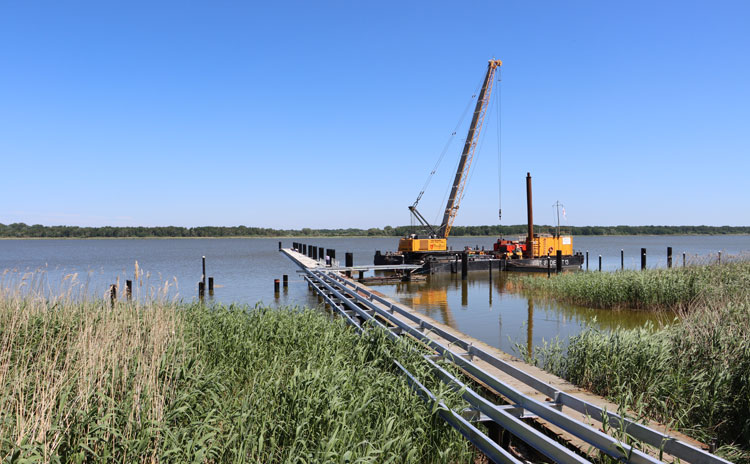 Die Vorbereitungen für den Bau der Steganlage am Bärwalder See im Lausitzer Seenland haben nun planmäßig begonnen. In wenigen Wochen soll alles fertig sein, wenn die Häuser kommen.