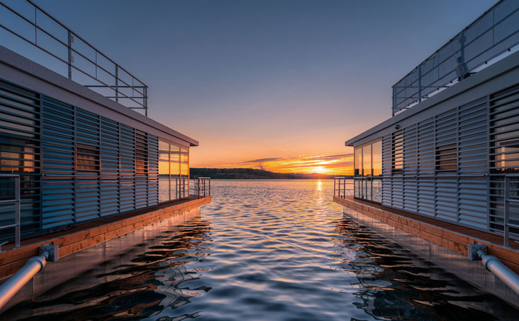 Die neue Anlage für 11 schwimmende Ferienhäuser im Baltic Sea Resort - Marina Kröslin ist fertiggestellt. Die Vermietung der floating houses beginnt in Kürze.